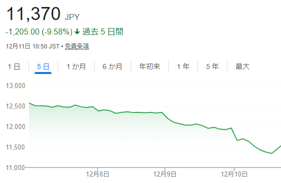終値ベースでも 4 営業日連続の下落となり、12月の営業日8日間で7日下落。